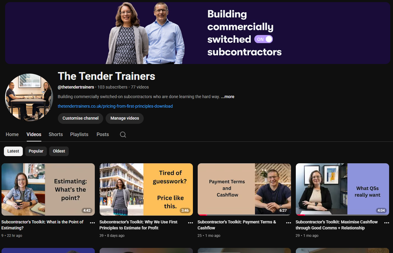 Our YouTube channel is packed with over 75 bite-sized videos spilling the best tips on tendering and commercial management. Quick, practical, and designed to help you nail your numbers and tackle those tricky project challenges!Ā